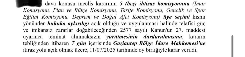 11 Temmuz 2025 tarihinde oy birliğiyle alınan karar doğrultusunda, önümüzdeki ilk Şehitkamil Belediye Meclisi toplantısında söz konusu komisyonlar için yeni bir seçim yapılacak. Mahkeme kararına karşı Gaziantep Bölge İdare Mahkemesi’ne itiraz yolu ise açık.