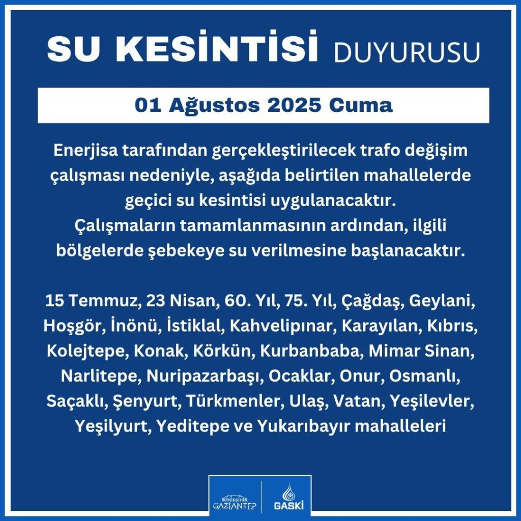 GASKİ tarafından yapılan açıklamada, kesintinin sebebi olarak Enerjisa’nın yürüttüğü trafo yenileme çalışmaları gösterildi. Yetkililer, kesintinin geçici olduğunu ve çalışmalar tamamlandığında suyun yeniden verileceğini belirtti.