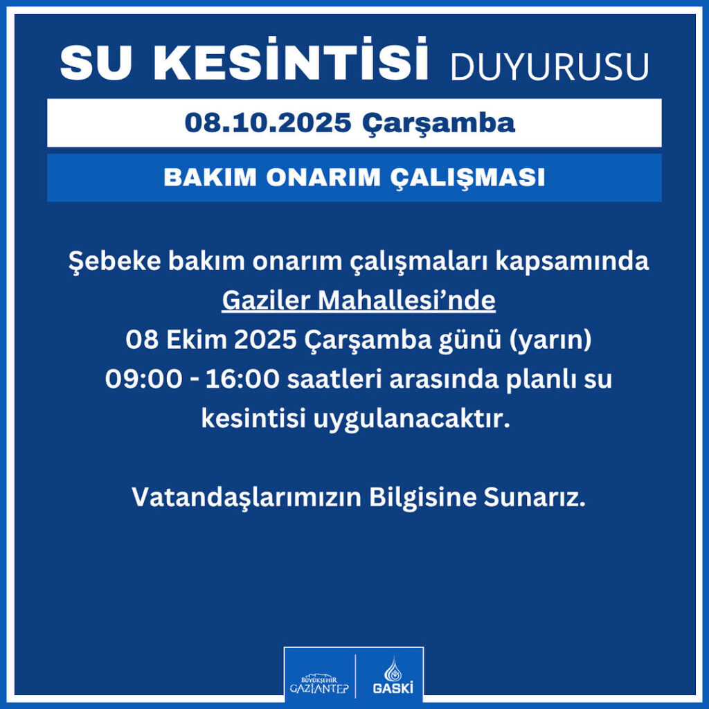 GASKİ, şebeke bakım ve onarım çalışmaları nedeniyle 08 Ekim 2025 Çarşamba günü 09.00 – 16.00 saatleri arasında Gaziler Mahallesi’nde su kesintisi uygulanacağını duyurdu.