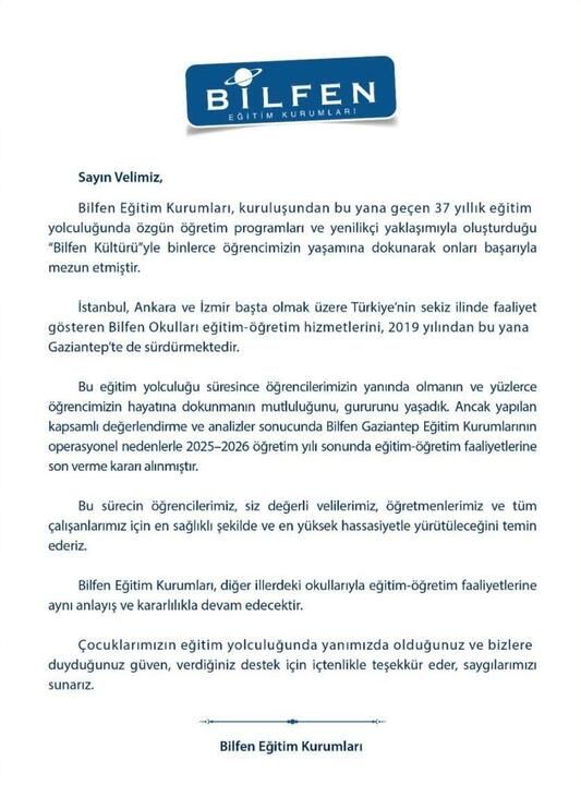 Edinilen bilgilere göre Bilfen Eğitim Kurumları yönetimi, velilere gönderdiği yazılı bilgilendirme ile Gaziantep’te yürütülen eğitim-öğretim faaliyetlerinin 2025–2026 eğitim-öğretim yılı sonunda sona ereceğini duyurdu.