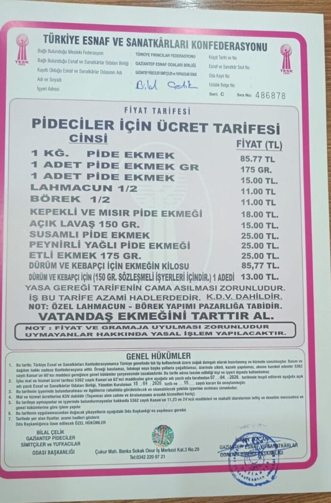 Güncellenen fiyat listesine göre; 1 kilogram pide ekmeğin fiyatı 85 lira 77 kuruşa çıktı. Ayrıca lahmacun ve börek 11 TL, kepekli ve mısır ekmeği 18 TL, açık lavaş 15 TL, peynirli yağlı ekmek 25 TL, susamlı pide ekmeği 25 TL, etli ekmek 25 TL olarak satışa sunulacak. Dürüm ve kebapçılarda kullanılan ekmek fiyatı ise 13 TL olarak belirlendi.